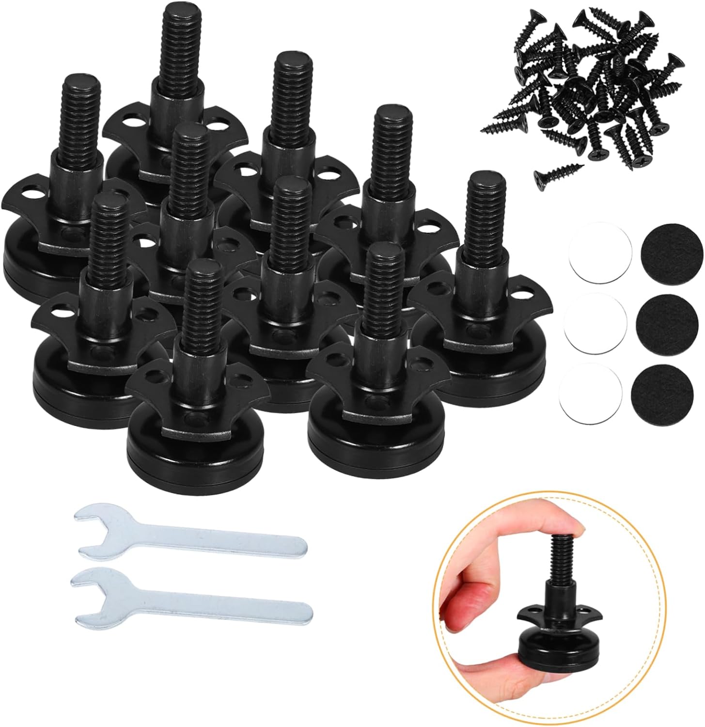 Package List 12 x furniture levelers 12 x gasket 2 x wrench 36 x screw Characteristics -Size:3.50X3.50X1.70cm/1.38X1.38X0.67in (Size nut) adjustable chair legs leveling feet -Size:5.50X3.40X3.40cm/2.16X1.34X1.34in (Size leveling feet) furniture leveling feet screw -Universal compatibility: these adjustable feet are highly compatible and suitable for various furniture bases, allowing for quick installation and adjustment furniture leveling leg -Size:10.00X2.90X0.30cm/3.93X1.14X0.12in (Size wrench) furniture feet levelers -Thread diameter: 4 mm threaded furniture leveling foot -Color:Black self leveling furniture feet -Size:3.50X3.50X0.35cm/1.38X1.38X0.14in (Size gasket) adjustable feet for furniture -Sturdy support: the triangular nut design ensures stable support, easily handling uneven floors and keeping your furniture furniture height adjustable feet -Thread: 3/8"-16 furniture leg levelers -Material:Iron furniture leveling foot -Durable materials: made from materials, these leveling feet are wear resistant and durable, ensuring long term use and extending the life of your furniture threaded furniture feetGoods Descriptionadjustable self leveling furniture feet Designed to provide stability and balance, these adjustable furniture leveling feet feature a triangular nut and threaded screw mechanism.heavy duty adjustable leveling feet Their sleek design ensures compatibility with various furniture styles, while the durable construction makes them ideal for uneven surfaces, a practical solution for maintaining furniture alignment