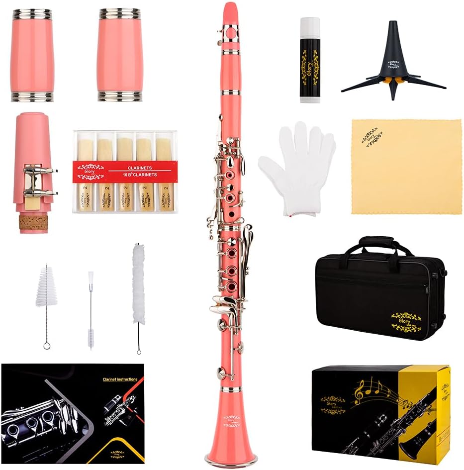Glory GLY-PBK Professional Ebonite Bb Clarinet with 10 Reeds, Stand, Hard Case, Cleaning Cloth, Mouthpiece Brush and Pad Brush, Black