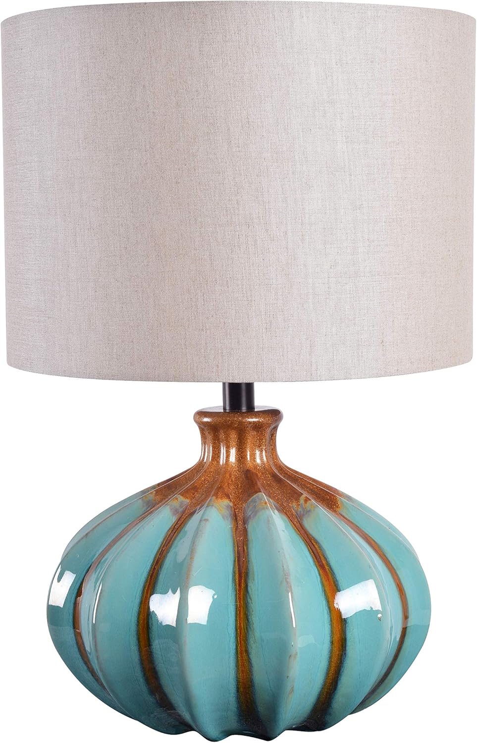 Showcase your fun, eclectic sense of style with this uniquely-profiled accent lamp. Teal, ceramic glaze with burnished gold accents dripped along the ridges of the lamp body create a bold pop of color from on top of your living room end tables. 3-Way lighting makes this lamp the perfect, multi-functional accent – fill your home with bright illumination, an ambient glow, and everything in between to suit your needs. The teal color paired with the warm gray drum shade makes this piece suitable for bohemian, modern farmhouse, or even casual contemporary décor. Perfect for setting up fall décor in your home or simply adding a touch of eclectic style to your carefully curated collection, this accent lamp’s unique pumpkin-like profile and teal ceramic glaze will create the perfect boho accent.