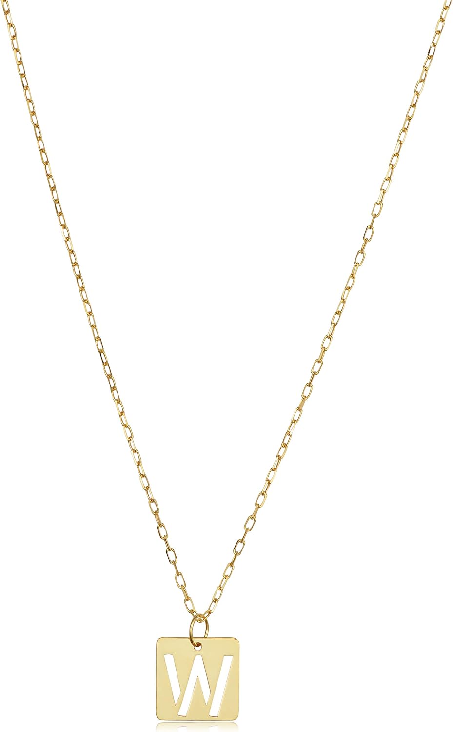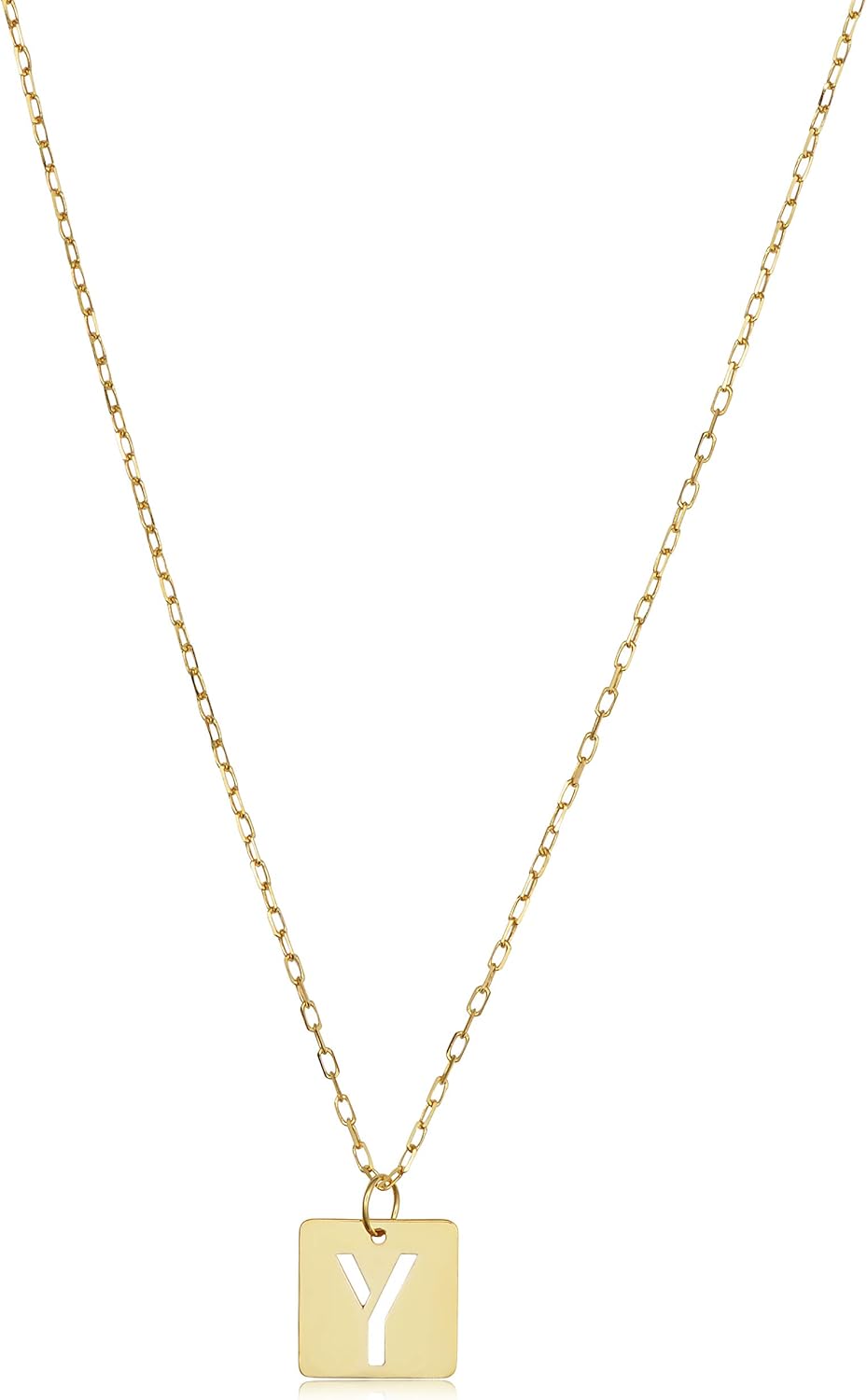 An absolutely charming gold necklace for women that showcases a gold square pendant with a cut-out letter alphabet. This women's gold jewelry is made in Italy of genuine 14k yellow gold and features the radiance of high polish finish. This gold alphabet necklace is simple and lightweight, making it an ideal gold jewelry for everyday all day wear.